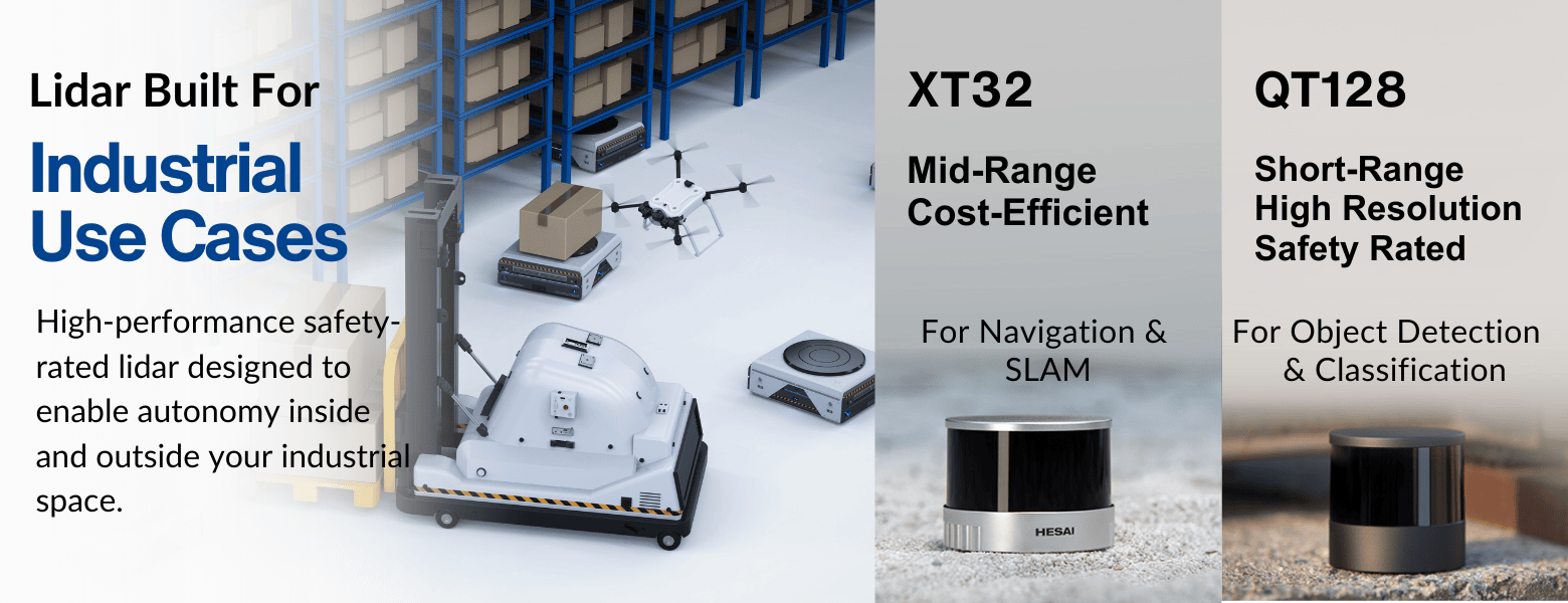 The modern industrial automation market requires safety, security, and ease of integration and these sensors we designed with those requirements in mind. The QT128 with its newly obtained ISO 26262 ASIL B  Functional Safety Standard and its high-resolution object detection capabilities make it the ideal lidar for AGVs, AMRs, and autonomous forklifts, reducing risks associated with operating autonomous vehicles and enhancing the safety of people and equipment. For navigation and SLAM, the XT32 provides a high performance, cost effective solution for many industrial applications.